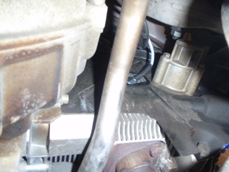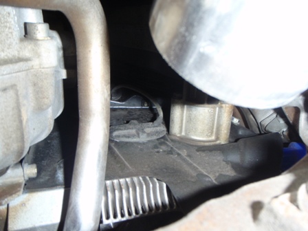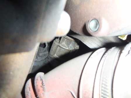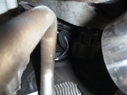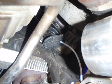 車を後ろから見て左側、ヒートエクスチェンジャーからのパイプ(かな?)の陰です。
